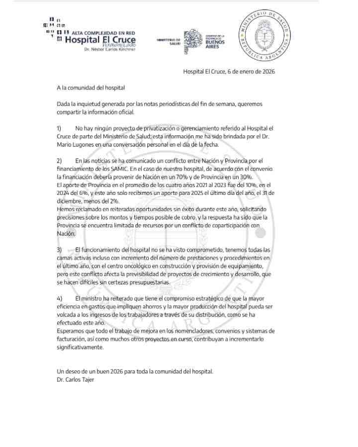 Según se detalla en la misiva, fechada el 6 de enero de 2026 y firmada por el presidente del Consejo de Administración del nosocomio, Carlos Tajer, “no hay ningún proyecto de privatización o gerenciamiento referido al Hospital El Cruce de parte del Ministerio de Salud”. La aclaración surge tras una conversación personal mantenida ese mismo día con el ministro de Salud, Mario Lugones.