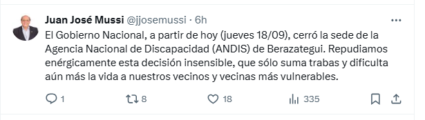 Intendente de Berazategui, Juan José Mussi, manifestó a través de sus redes sociales un repudio al cierre de la sede local de la Agencia Nacional de Discapacidad (ANDIS), dispuesto por el Gobierno Nacional a partir de este jueves 18 de septiembre