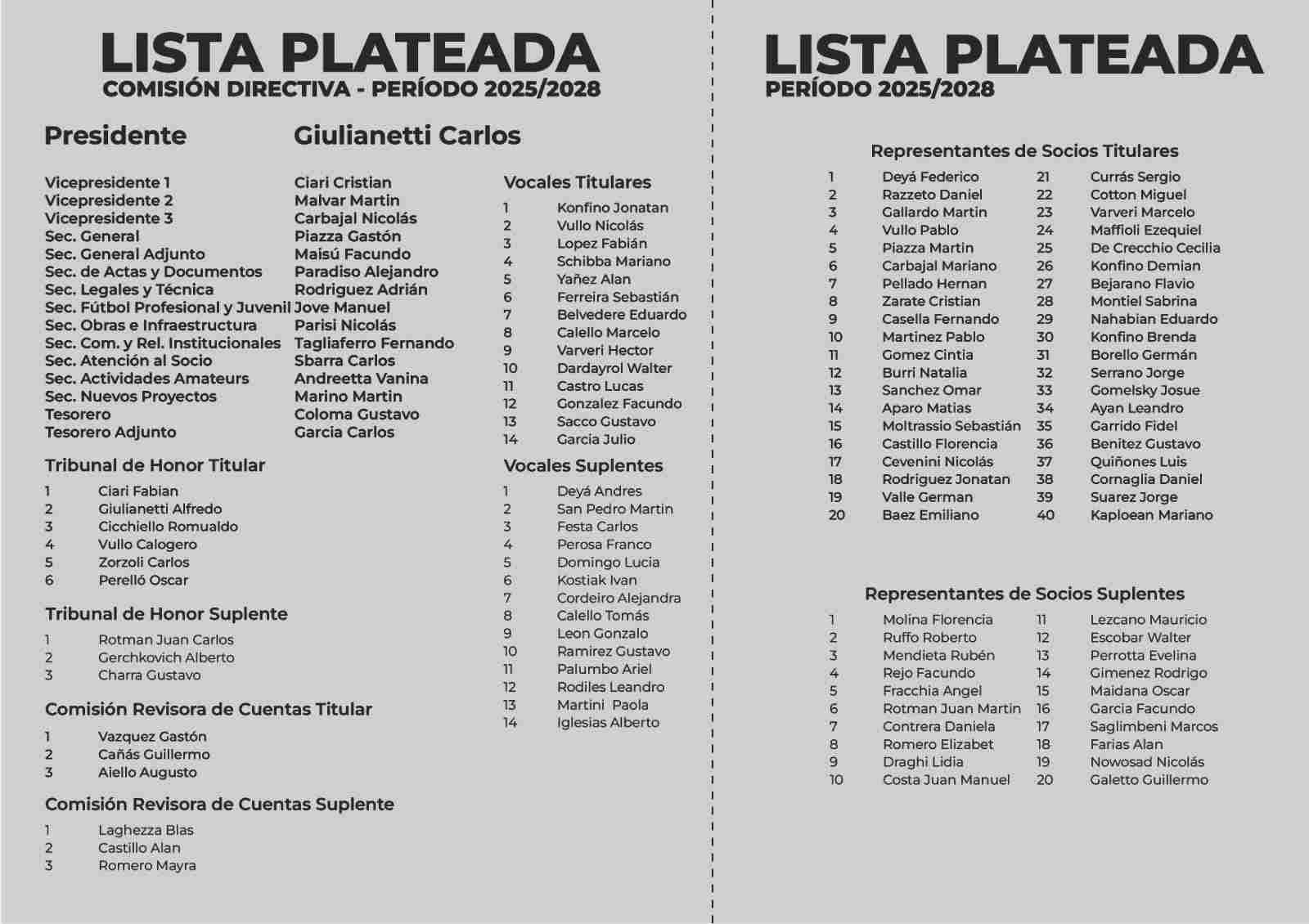 La lista se completa con los vocales titulares y suplentes, además de los representantes de socios en sus dos categorías, lo que configura un armado amplio con fuerte presencia de distintos sectores de la vida social e institucional.